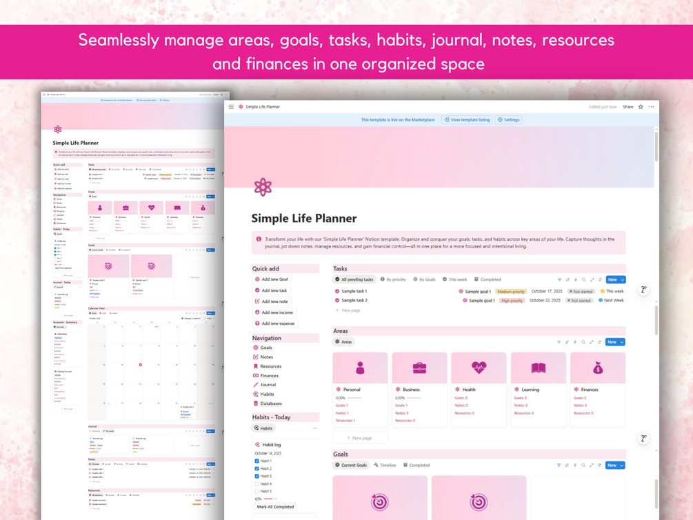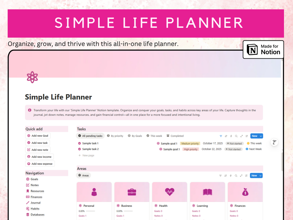 The Simple Life Planner is your all-in-one Notion system designed to help you organize, manage, and thrive across every area of life. It’s a holistic digital hub that brings clarity, structure, and balance — empowering you to live intentionally and productively.