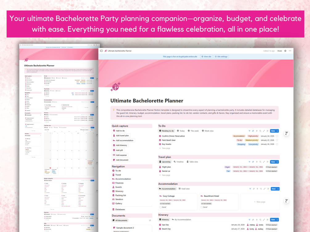 Planning a bachelorette party should be fun, not stressful. Our Ultimate Bachelorette Planner Notion Template is the ultimate tool to organize an unforgettable celebration without the headache.