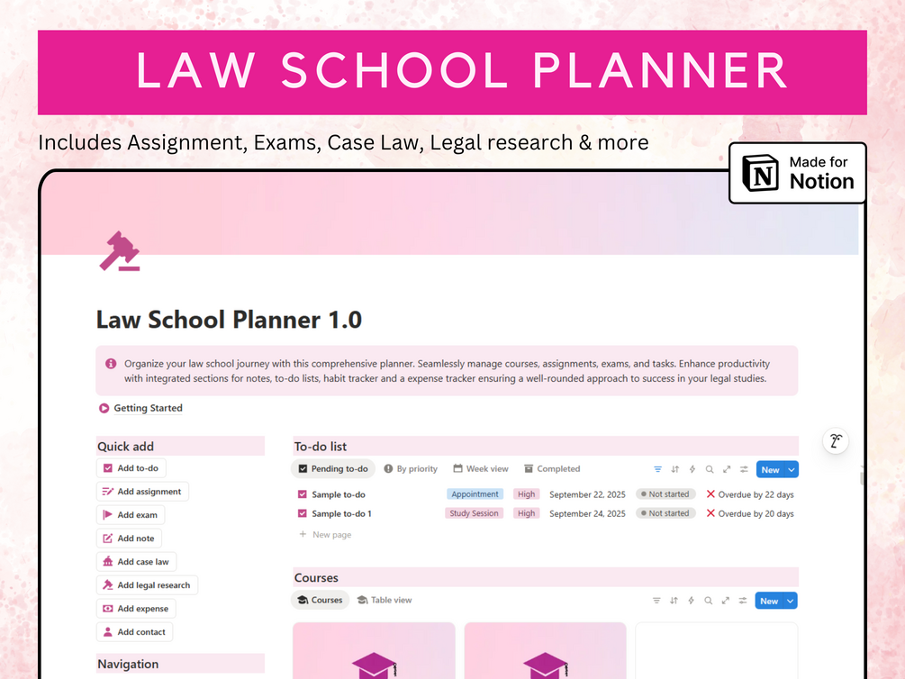 The Law School Planner is your all-in-one Notion workspace designed to help law students stay organized, productive, and in control of their academic journey. Customize it easily by removing placeholder data and tailoring it to your unique needs.